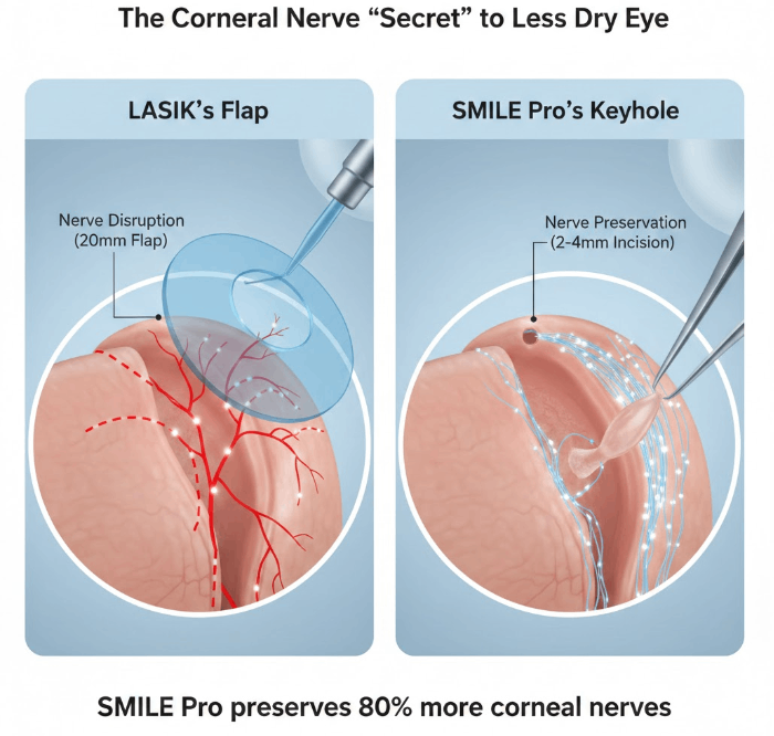 SMILE Pro preserves 80% more corneal nerves than LASIK by using a tiny 2mm incision instead of a large flap, maintaining the natural tear-production signal and ensuring faster recovery.