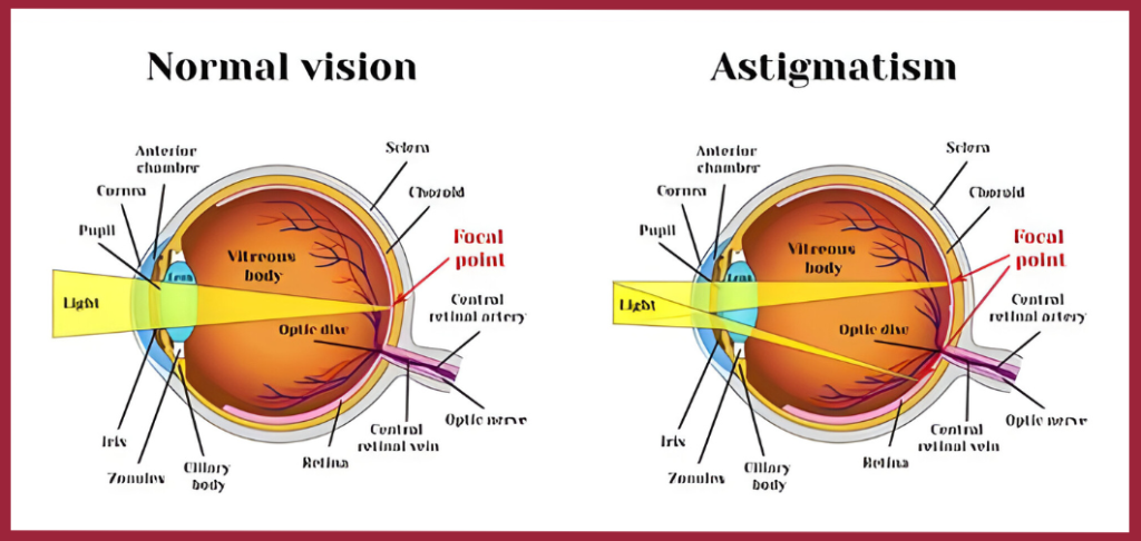 Astigmatism is a common eye problem that makes things look blurry because your eye is shaped a bit funny. But the good news is, it’s easily fixed with glasses or contacts. These special lenses help your eyes focus better, so you can see the world clearly without any blurriness. Just pop them on, and you’re good to go!