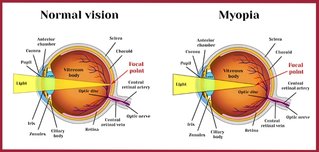 Myopia develops when the eyeball is too long or the cornea (the front part of the eye) is too curved. These irregularities cause light rays to focus in front of the retina instead of on it, leading to blurred vision.